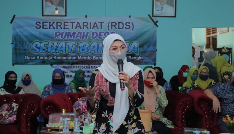 TerabasNews – KEMUJA – Ketua TP PKK Provinsi Kepulauan Bangka Belitung (Babel), Melati Erzaldi menghadiri agenda pemberian makanan tambahan di Gedung Serba Guna Desa Kemuja, Kamis (17/9/20).