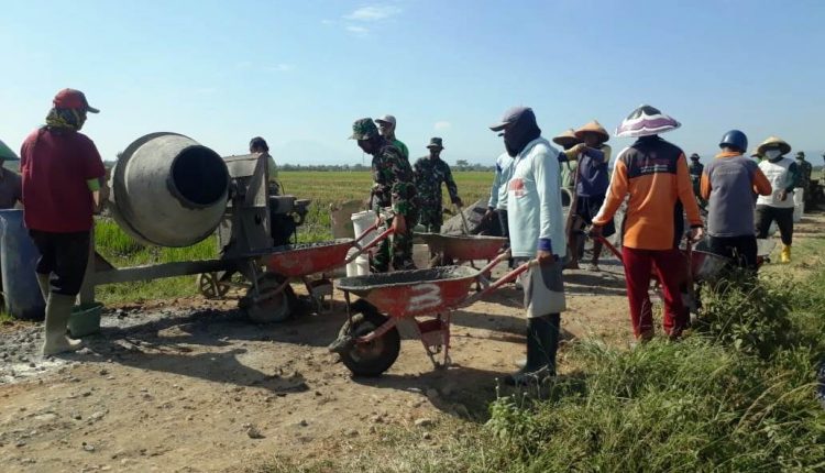 TerabasNews -:KENDAL, Selasa 22/09 – Kebersamaan dan kekompakan anggota satgas TNI Manunggal Membangun Desa (TMMD) Reguler Ke-109 Kodim 0715/Kendal dengan masyarakat Desa Sendang Kulon, Kecamatan Kangkung, Kendal Jawa Tengah terus berlangsung di lokasi TMMD. Mereka dengan ikhlas ikut mengangkut adukan semen dan pasir bersama warga.