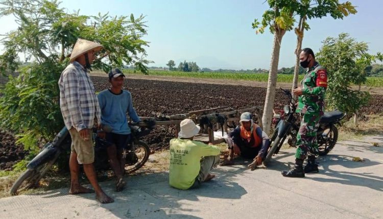 Seperti yang dilakukan anggota satgas TMMD saat istirahat kerja menyempatkan diri untuk bersilaturahmi dengan para petani yang ada di desa Sendang Kulon, tampak anggota satgas TMMD menemui petani saat berada di sawah.