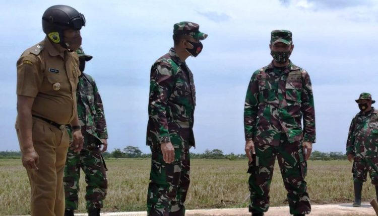 Tampak Ketua tim wasev Itdam Kolonel Inf Samsul Bakhri yang didampingi Dandim Kodim 0715 Kendal Letkol Inf Iman widhiarto beserta Camat Kangkung dan Kepala Desa Sendang kulon. Saat meninjau lokasi kegiatan TMMD di Desa Sendang kulon.