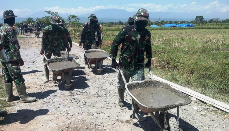 TerabasNews – KENDAL, Jumat 2/10 – Para prajurit TNI yang tergabung dalam satgas TMMD Reguler Ke-109 Kodim 0715/Kendal bersama warga Desa Sendang Kulon terlihat begitu riang gembira bagaikan tak kenal lelah dalam mengangkut adukan cor dengan angkong sambil balapan di lintasan pengecoran jalan.