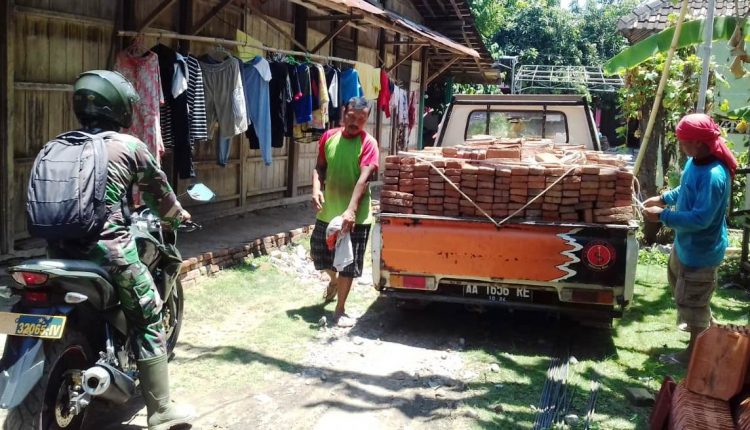 Menurut Babinsa Serka Nasikoen, untuk mengejar target rehab rumah Harni, kendaraan angkut material batu mata pun keluar masuk ke lokasi itu.