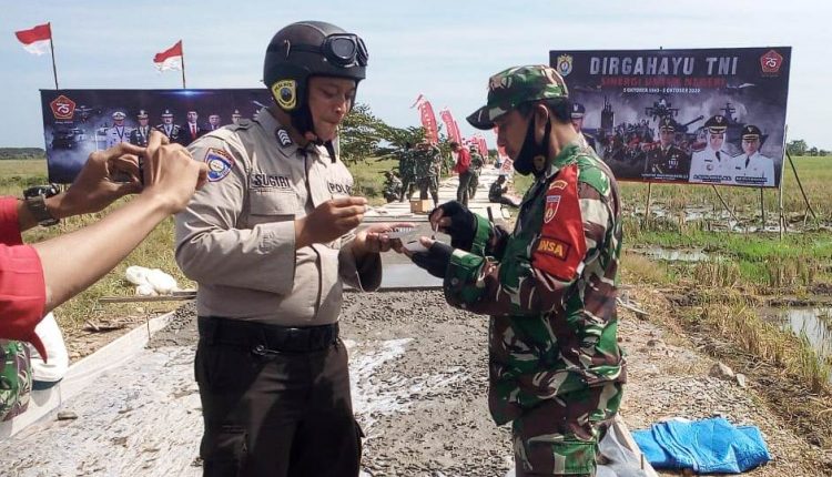 Peringtan HUT TNI ke 75 di Lokasi TMMD, Babinsa Terima Suapan Roti Dari Bhabinkamtibmas