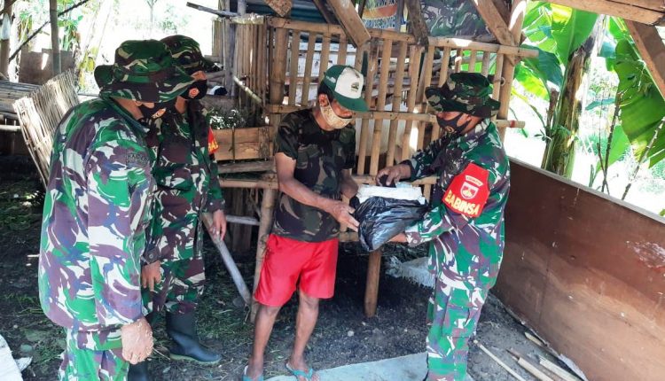 Seperti yang dilakukan Kapten Inf Widodo Hendrarjo, koordinator Tim Satgas TMMD, di sela-sela bekerja di lokasi TMMD, sempatkan membantu Mirat (57) warga setempat yang sedang memberi pakan kambing nya.