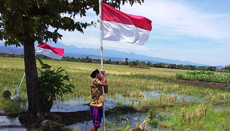 Adalah Sarmadi (56), Warga Dusun pening Desa Sendang Kulon, sedang menancapkan kembali tiang Bendera yang jatuh terkena tiupan angin.