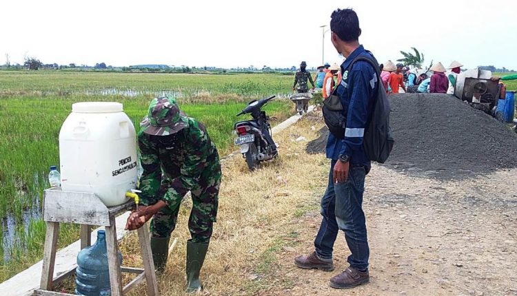 Disaat itulah Danpos Kangkung Pelda Supriadi, selaku yang dituakan di lokasi pengecoran jalan memberikan contoh kepada para anggota Satgas TMMD maupun warga yang terlibat pengerjaan betonisasi jalan, untuk mencuci tangan terlebih dahulu sebelum kembali kerumah masing – masing.