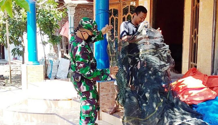 Sersan Satu Tri Juni anggota Satgas TMMD Kodim 0715/Kendal, meluangkan waktunya untuk main main ke pantai pening, serta menyempatkan mampir dan ngobrol sambil membantu menjemur jaring Ngasro (50) nelayan Dusun pening.