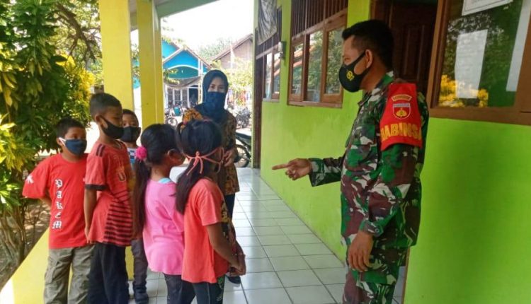 Seperti yang dilakukan Sertu Hartono saat sambangi warga dan melihat anak-anak bermain di halaman sekolah ada yang pakai masker bahkan banyak yang tidak pakai.