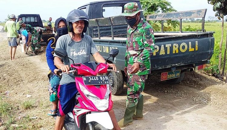 “Pak sebaiknya kalau bepergian patuhi aturan yang sudah diterapkan pemerintah geh, salah satunya dengan memakai masker, ” Ujar Sutrisno Anggota Satgas TMMD Kodim 0715/ Kendal.
