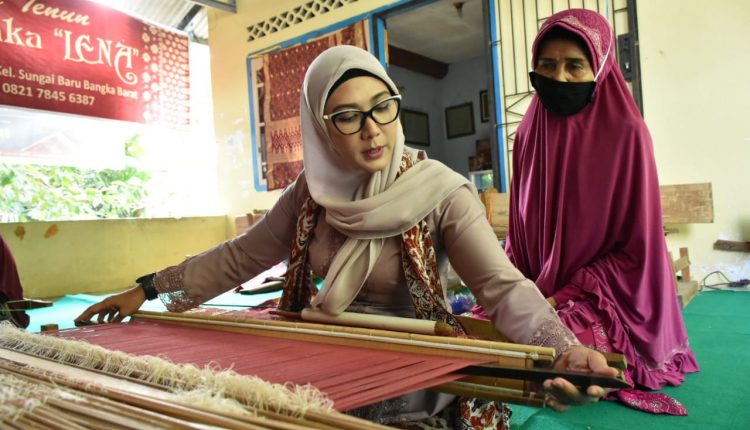 TerabasNews – MUNTOK – Kunjungi Kelompok Tenun Bunda Cempaka “Lena”, Senin (19/10), Ketua Dewan Kerajinan Nasional Daerah (Dekranasda) Provinsi Kepulauan Bangka Belitung, Melati Erzaldi menegaskan bahwa, membuat tenun songket itu tidak mudah, semakin sedikit jumlah benang yang digunakan itu akan mempengaruhi tekstur atau kelembutan hasilnya.