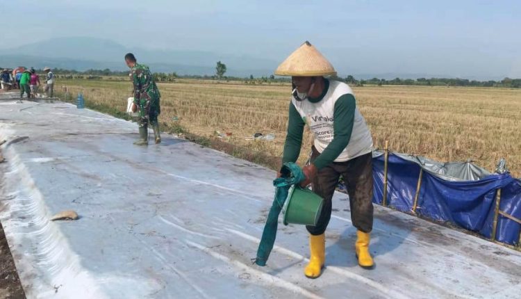 TerabasNews – KENDAL, Kamis 22/10 – Sejumlah personil TMMD Reguler ke-109 Kodim 0715/Kendal yang tengah tuga di Desa Sendang Kulon, Kecamatan Kangkung, Kabupaten Kendal, Jawa Tengah, dengan dibantu warga, diplot untuk melakukan perawatan hasil pengecoran jalan yang sudah selesai. Hal itu dimaksudkan agar hasil akhir nanti bagus dan tidak mudah pecah.