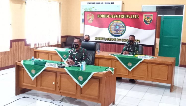 TerabasNews – Namang (Penrem 045/Gaya) – Danrem 045/Gaya Brigjen TNI M Jangkung Widyanto, S.I.P., M.Tr.(Han) mengikuti Rapat Koordinasi (Rakor) Penyiapan Pilkada Serentak Tahun 2020 dalam rangka mendukung kelancaran tahapan penyelenggaraan Pilkada Serentak tahun 2020 di wilayah Sumbagsel bertempat di Makorem 045/Gaya, Namang, Bangka Tengah. Jumat (23/10/2020).