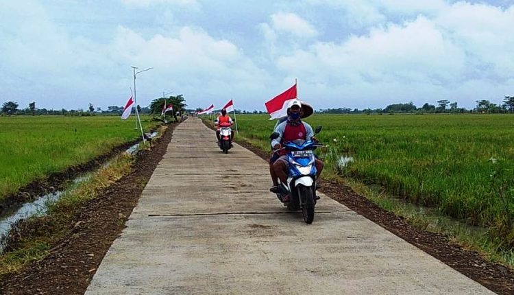 Suroso (55), salah satu warga Desa Sendang Kulon saat sedang jalan pagi sambil berboncengan menggunakan sepeda motor, melewati betonisasi jalan yang baru saja diresmikan.