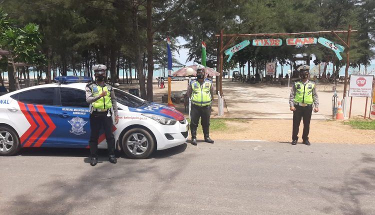 Cegah Penyebaran Covid-19 Satlantas Polres Bangka Laksanakan Giat Patroli Prokes di Tempat Wisata