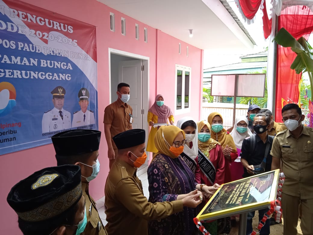 Seusai pelantikan acara dilanjutkan dengan peresmian Pos PAUD Kelurahan Taman Bunga, yang ditandai dengan pemotongan pita dan penandatanganan prasasti serta pemotongan tumpeng oleh Monica Haprinda selaku Ketua TP PKK Kota sekaligus Bunda PAUD Kota Pangkalpinang. (adv)