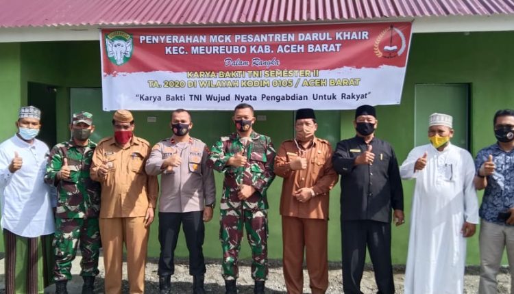 TerabasNews – Aceh Barat – Komandan Kodim 0105/Abar Letkol lnf Dimar Bahtera S.Sos M.A.P secara langsung meresmikan dan menyerahkan bantuan berupa bangunan MCK kepada Dayah Darul Khair yang secara simbolis diterima oleh Pimpinan Dayah Tgk.Sulaiman S.Kom.l. Kegiatan ini dalam rangka Karya Bhakti TNI Semester ll TA. 2020 bertempat di Jalan Datok Janggot Meuh Desa Meureubo Kecamatan Meureubo, Selasa (29/12/2020)