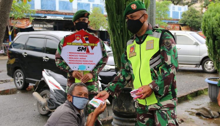 TerabasNews – Kodim Pati – Pembagian masker kembali dilakukan oleh personel gabungan Kodim 0718/Pati bersama Polres Pati, sasarannya adalah di pasar dan terminal Pati.