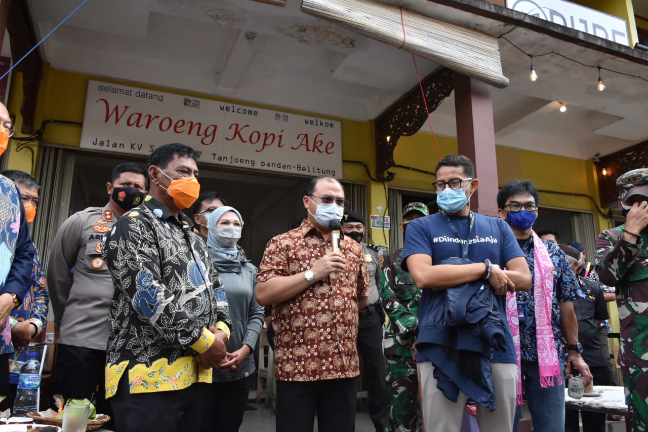 TerabasNews – TANJUNG PANDAN – Menteri Pariwisata dan Ekonomi Kreatif RI, Sandiaga Uno, mengakui keindahan Belitung saat berkunjung dan menikmati santap pagi di Waroeng Kopi Ake Kawasan KV Senang, Tanjung Pandan, Kabupaten Belitung, Jumat (5/2/21).