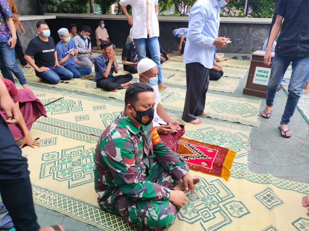 Dalam penerapan protokol kesehatan masjid Fatimah Kelurahan Kemlayan Kec. Serengan selain mengecek suhu tubuh para warga yang akan melaksanakan sholat Jum’at berjamaah. Para Babinsa juga menghimbau agar warga yang akan melaksanakan ibadah tetap menggunakan masker, mencuci tangan dengan handsinitizer/sabun dan menjaga jarak.