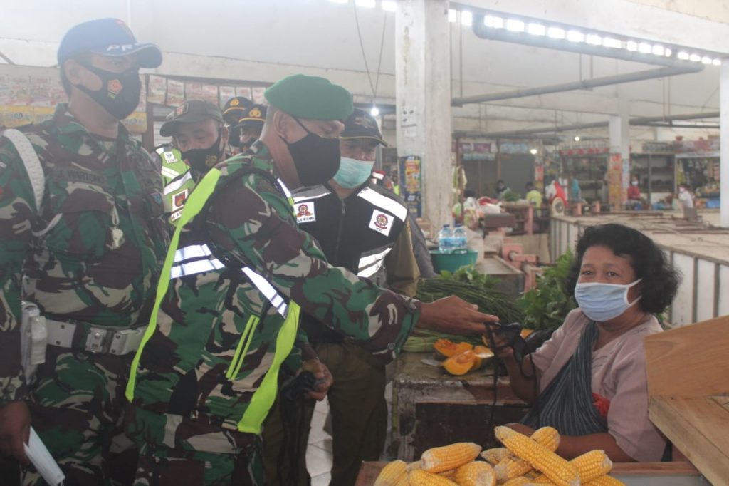 TerabasNews – Kodim Pati – Personel gabungan TNI-Polri dan Sat Pol PP Kabupaten Pati kembali membagikan masker kepada para pedagang dan pengunjung pasar, pagi tadi sasarannya adalah di pasar baru kecamatan Juwana. Senin,(08/02/2021)