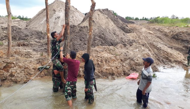 Kasdim 0431 Bangka Barat, Mayor Arm K Gurusinga, turun langsung memimpin kegiatan pembuatan jembatan penyebrangan sesuai perintah dari Dandim 0431 Bangka Barat , Letkol Inf Agung Wahyu Perkasa.
