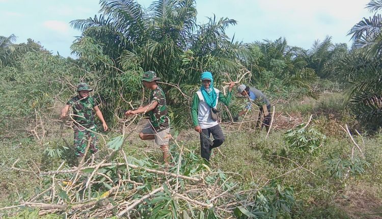 TerabasNews – Bangka Barat – Disela sela pengerjaan pemasangan pagar jembatan personel TMMD 0431/Babar Di pimpin Serda Andi dan Kopda Upar ikut membantu masyarakat Air limau panen singkong.