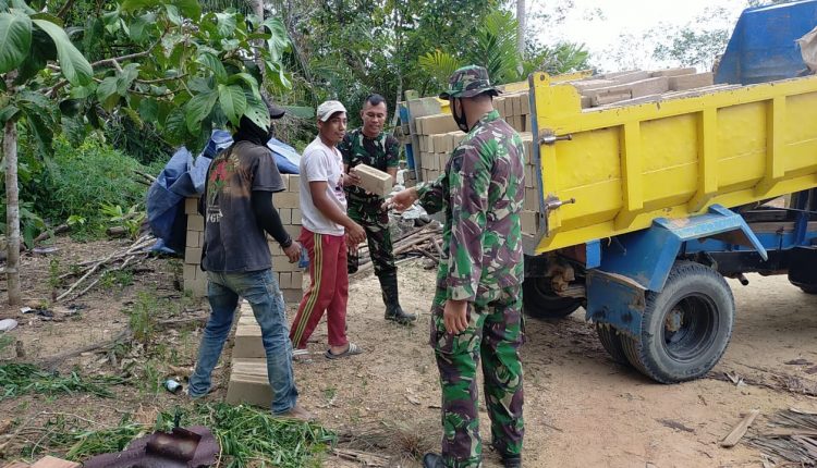 TerabasNews, Bangka Barat – Satgas TMMD ke 110 Kodim 0431/Bangka Barat bersama warga Air Belo gotong royong menurunkan material pembangunan RTLH milik Ibu Rohima 60 tahun.