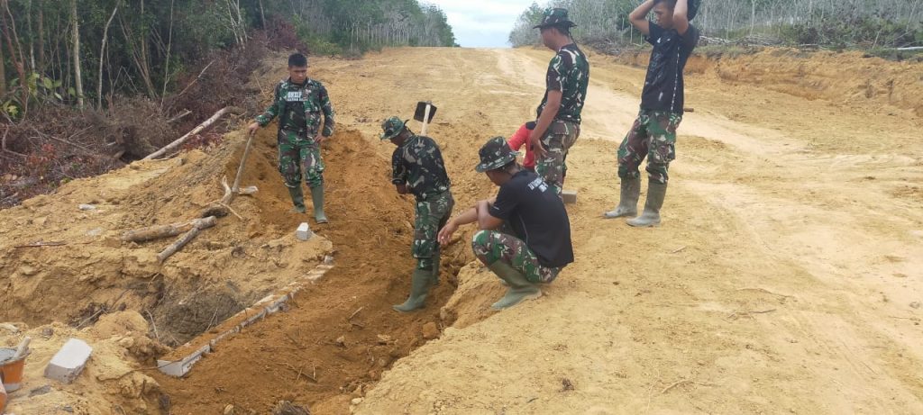 TerabasNews, Bangka Barat – Satgas TMMD ke 110 Kodim 0431/Bangka Barat bergotong royong membuat sayap gorong gorong yang pertama, Senin 8/3.