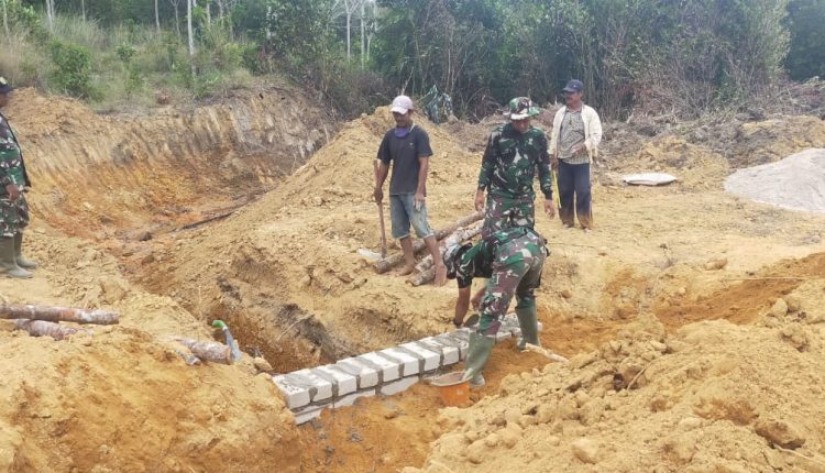 Pembuatan kuping gorong-gorong tersebut, satgas TMMD dibantu oleh dua orang warga.