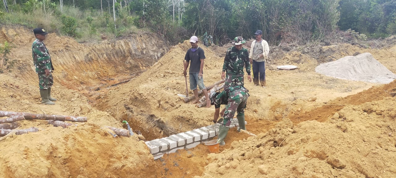 TerabasNews, Bangka Barat – Satgas TMMD ke 110 Kodim 0431/Bangka Barat bergotong royong membuat sayap gorong gorong yang pertama, Senin 8/3.