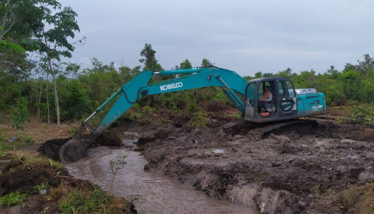 Letkol Inf Agung Wahyu Perkasa, S.Sos mengatakan, dua unit Dozer D 65 P melakukan kegiatan mengumpulkan tanah untuk menimbun rawa lengkup berair 400 meter.