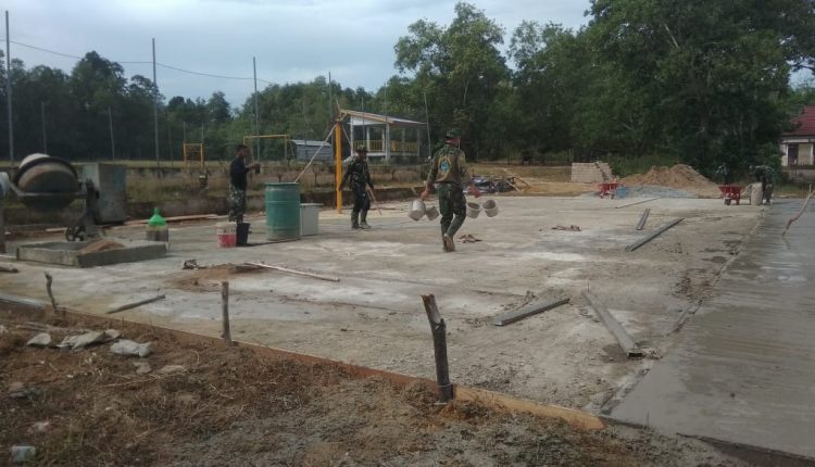 Terlihat satgas TMMD dengan masyarakat sekitar bergotong royong melakukan pengecoran pada lapangan voli.