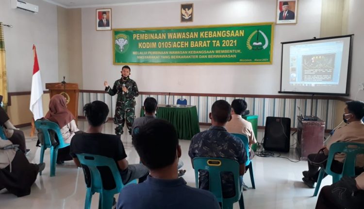 TerabasNews, Aceh Barat – Guna meningkatkan pemahaman dan kesadaran terhadap Siswa – Siswi maupun seluruh komponen bangsa dalam membentuk kepribadian, disiplin, terampil dan berjiwa kesatria serta memiliki rasa cinta tanah air yang berlandaskan Kebhineka Tunggal lka – an dengan semangat bela negara, Kodim 0105/Abar menghelat Pembinaan Wawasan Kebangsaan di Aula Makodim Jalan lmam Bonjol Desa Drien Rampak Kecamatan Johan Pahlawan, Jum’at (26/3/2021)