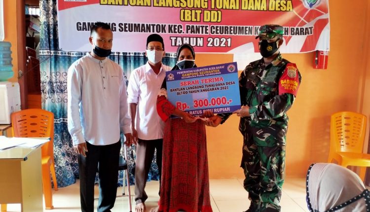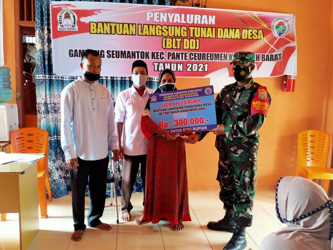 TerabasNews, Aceh Barat – Babinsa Posramil 05/Pante Cermin Kodim 0105/Aceh Barat Sertu Jajang Suherman dan Bhabinkamtibmas hadiri pembagian BLT Dana Desa, dalam Penyaluran BLT DD di wilayah Kecamatan Pante Ceureumin.