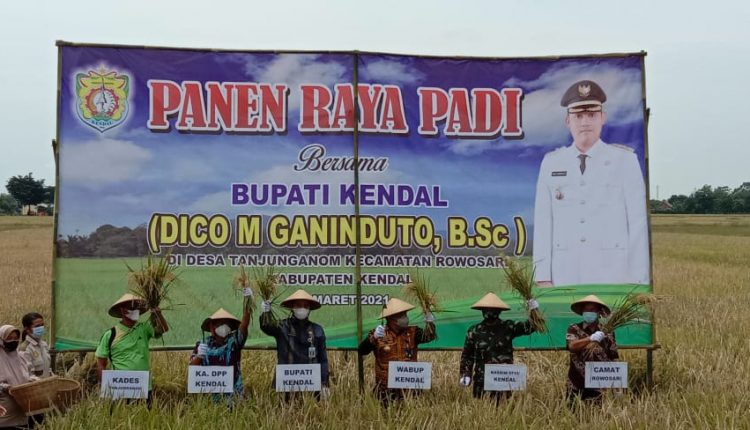 TerabasNews, KENDAL – Bupati Kendal dan Wakil Bupati Kendal di dampingi Dandim 0715, Asisten Pembangunan,Kepala Dinas Pertanian serta Forkopincam Rowosari menghadiri panen raya padi musim tanam 2021 oleh kelompok tani di desa Tanjung Anom Kecamatan Rowosarìi, Selasa (30/3).