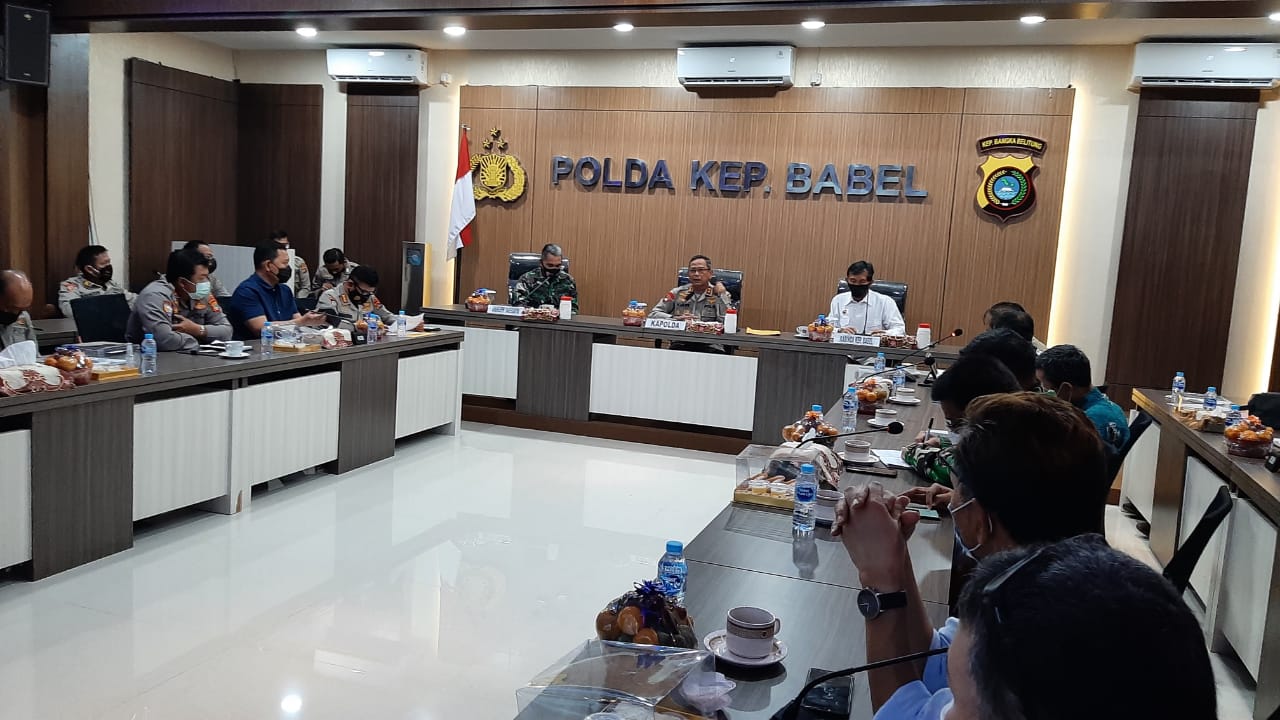 Mikron Antariksa (Sekretaris Gugus Tugas Covid-19 Prov. Kep. Babel, Bangun C. Utomo (Kepala KKP Prov. Kep. Babel), Adi Sucipto (Ketua IDI Prov. Kep. Babel), Para PJU Polda Kep Babel. Dan diikuti via sarana vicon oleh para Kapolres dan Dir RSUD di enam kabupaten. (R.H Penrem)