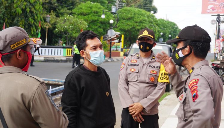 Petugas gabungan dari Polres Batang dan Satpol PP melaksanakan razia masker di Jalan Akhmad Yani tepatnya di depan Kantor Urusan Agama ( KUA) Batang.