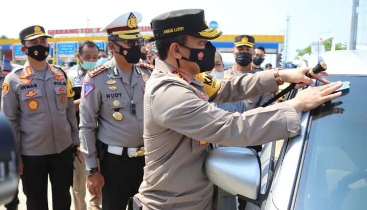 TerabasNews, SEMARANG – Kapolda Jateng Irjen Pol Ahmad Luthfi didampingi Kapolrestabes Semarang Kombes Irwan Anwar dan Kasatlantas Polrestabes Semarang, AKBP Sigit, melakukan pengecekkan kesiapan anggota dalam pemeriksaan arus balik di Pos Pengamanan Gerbang Tol Kalikangkung, Minggu pagi (16/5/21).