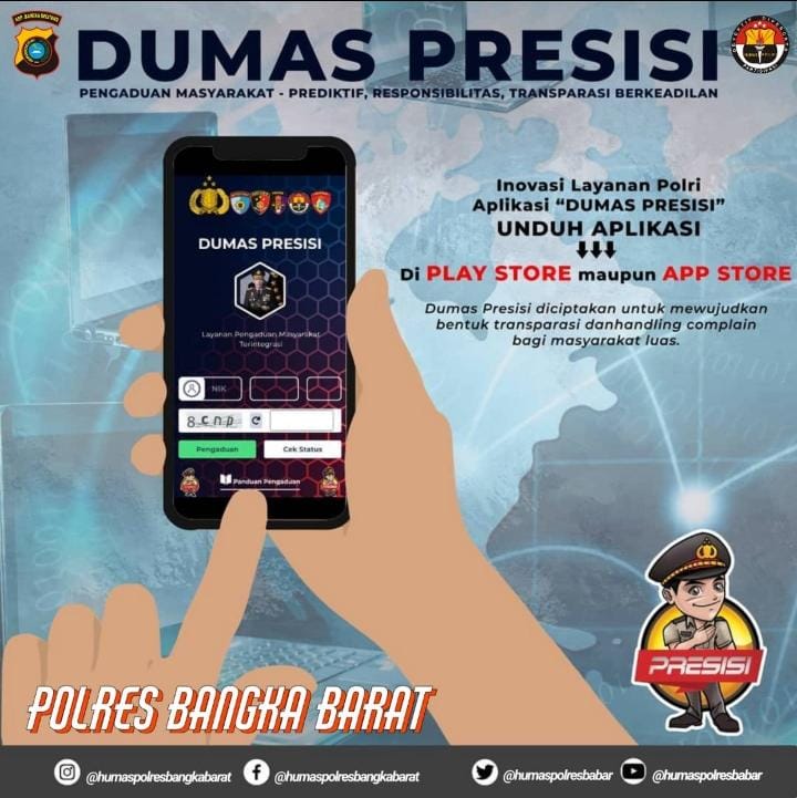 TerabasNews, Bangka Barat – Aplikasi Pengaduan Masyarakat (Dumas) Presisi (Prediktif, Responsibilitas, Transparansi Berkeadilan) yang telah dilaunching oleh Polri dan bisa diunduh melalui Playstore/AppStore merupakan upaya memudahkan masyarakat untuk mengadukan tentang kinerja kepolisian.