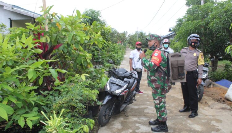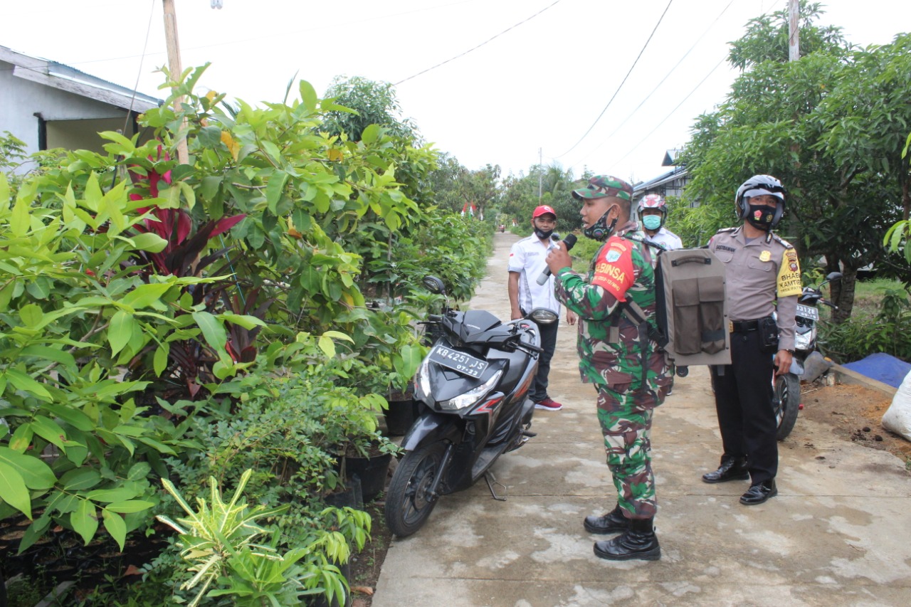Dengan menggunakan pengeras suara portable secara bergantian, Babinsa Serda Asriadi dan Bhabinkamtibmas Bripka Mulyanto menyampaikan kepada warga untuk menerapkan protokol kesehatan, guna pencegahan covid-19 terutama apabila melakukan aktifitas di luar rumah.