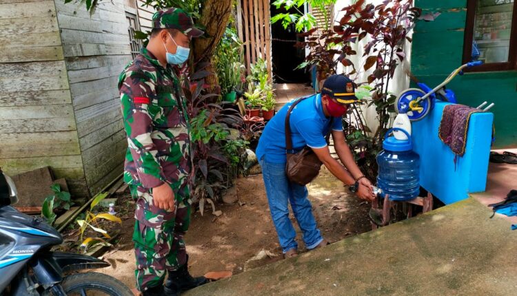 Dikesempatan tersebut Babinsa Istana Jaya Pratu Ades keliling kerumah warga mengecek sarana protokol kesehatan yaitu alat cuci tangan yang ada didepan rumah.