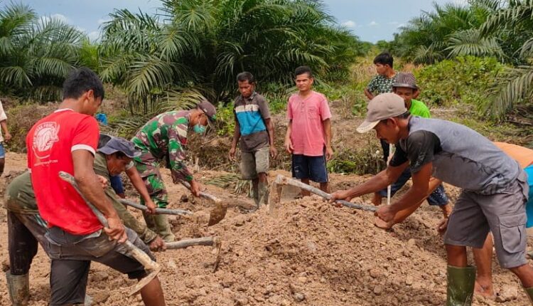 Dua Babinsa Muntai, Kodim 1203/Ktp Bersama Warga Timbun Jalan Rusak