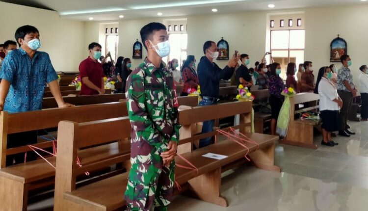Laksanakan Ibadah Ekaristi, Babinsa Sukakarya, Kodim 1203/Ktp, Sampaikan Protokol Kesehatan PPKM Mikro