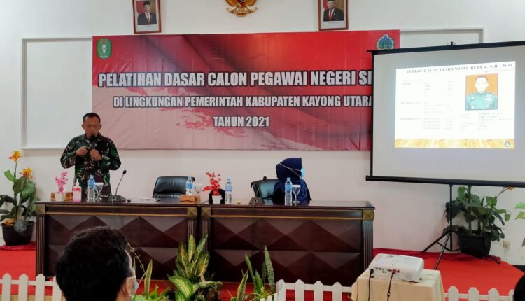 TerabasNews, Kayong Utara – Dalam kesempatan mengisi kegiatan Pelatihan Dasar CPNS Di Lingkungan Pemerintah Kabupaten Kayong Utara Tahun 2021 di Ballroom Hotel Mahkota Sukadana Dandim 1203/Ktp, Letkol Kav Suntara Wisnu Budi Hidayanta, SH, M.Sc., memberikan materi Kesiapsiagaan Bela Negara, Kamis (10/6/2021).