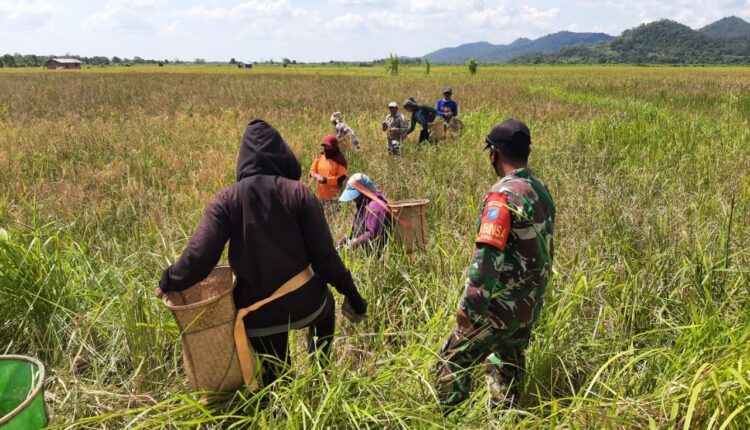TerabasNews, Ketapang – Bentuk kemanunggalan TNI bersama rakyat dalam mewujudkan ketahanan swasembada pangan, Babinsa Koramil 1203-03/Kdw, Kodim 1203/Ktp Pratu Selamet memberikan motivasi kepada petani saat membantu warga panen padi di Desa Keramat Jaya, Kecamatan Kendawangan, Kabupaten Ketapang, Kamis (17/6/2021).