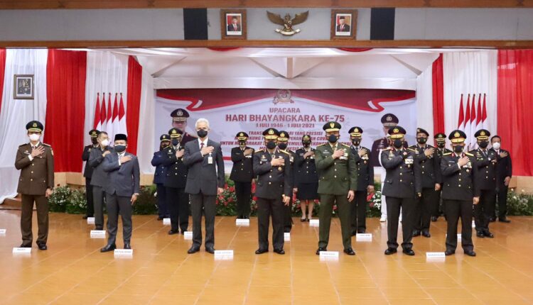 TerabasNews, Semarang – Polda Jawa Tengah gelar Upacara HUT Bhayangkara ke -75 secara sederhana dengan personil terbatas dan menerapkan prokes ketat. Kamis (1/7/2021). Upacara diselenggarakan secara virtual bertempat di Gedung Borobudur Mapolda Jawa Tengah.