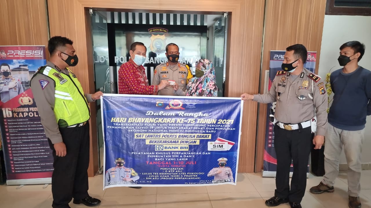 Pembuatan dan perpanjang SIM gratis bagi masyarakat Kabupaten Bangka Barat yang lahir pada tanggal 1-10 Juli dan memenuhi persyaratan untuk memiliki SIM itu diberikan langsung oleh Kapolres Bangka Barat dan Satuan Lalu Lintas Polres Bangka Barat dalam rangka memperingati Hari Bhayangkara ke 75 tahun 2021.