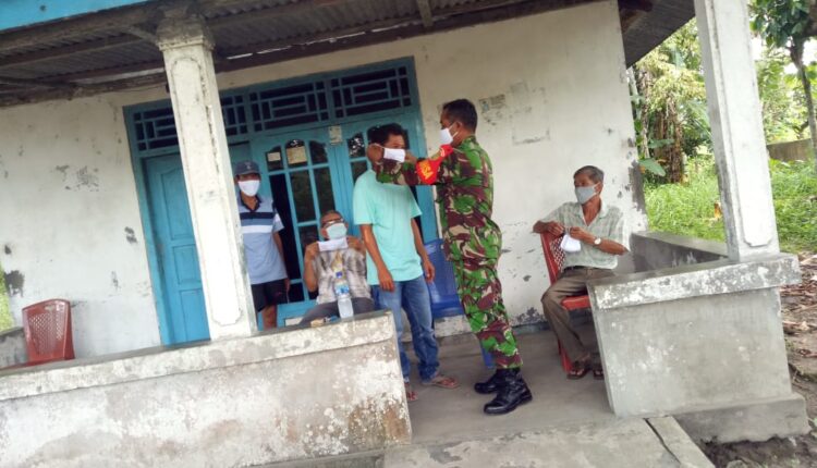 Danramil 431-01/Jebus Kapten Czi Maharuddin juga mengatakan, komsos yang dilakukan babinsa selain menganjurkan warga untuk mematuhi prokes COVID-19, kita juga membagikan masker.