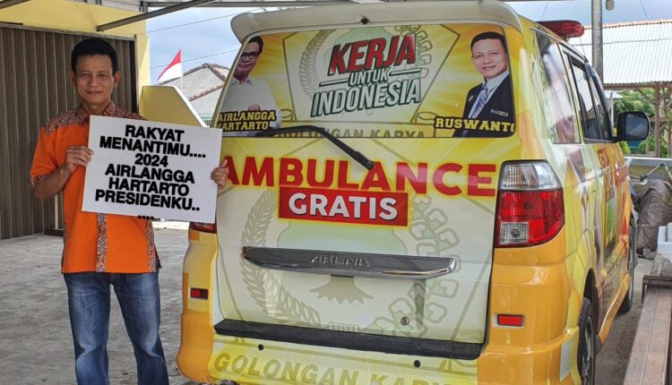 Hanya saja, ada yang berbeda dari tampilan mobil ambulance milik Ruswanto yang dulunya hanya dihiasi dengan foto ia seorang, kini tampak ada foto Ketua Umum DPP Partai Golkar, Airlangga Hartarto.