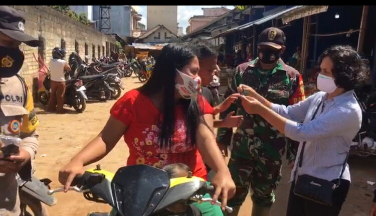 Terabasnews, Jebus – Babinsa Koramil 431-01/Jebus, Serda Ngadino bersama tim gugus tugas Covid-19 Kecamatan Parittiga melaksanakan monitoring, imbauan dan membagikan masker gratis kepada Masyarakat di Pos PPKM level III di Pasar Tradisonal Desa Puput Kecamatan Parittiga dalam rangka mengatasi penebaran Covid-19 di daerah itu, Minggu (22/08).